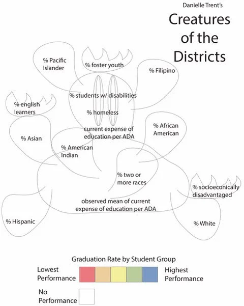 I create abstract soft sculpture ‘creatures' that are data visualizations representing the inequalities in K-12 Los Angeles public school districts' student demographics and funding.